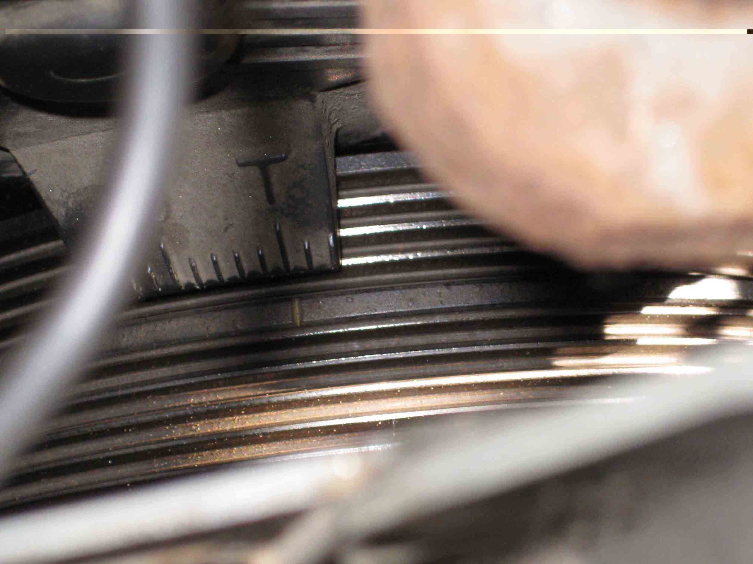5) Выставляем первый цилиндр в ВМТ, на распредвалах совмещая метки, совмещая метки на шкиве снизу. Я сразу же помечаю канцелярской замазкой ремни-шкивы (у друга подсмотрел – зато потом никакого гемора с выставлением меток):