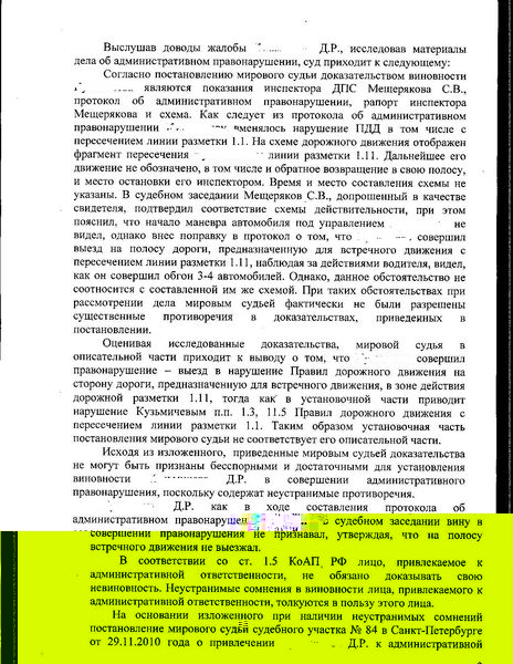 Кроме того: - Если сопоставить протокол и схему, составленные инспектором и приобщенные к делу, а так же фотографию разметки участки дороги, то можно увидеть, что линии разметки 1.1 на этом участке дороги нет, а есть линия 1.11. Таким образом из протокола не следует, что водитель, управляя автомашиной совершил обгон связанный с выездом на встречную полосу движения в случае когда это запрещено ПДД на участке дороги с ограниченной видимостью с пересечением линии 1.1 разделяющей транспортные потоки противоположных направлений , маневр не был связан с разворотом , поворотом на лево, объездом препятствия ,направление движения Спб –Кингисепп, ответственность за которое предусмотрена ст. 12.15 ч 4 Кодекса об административных правонарушениях т.к линии 1.1 на этом участке нет. ГОСТ Р 52289-2004 говорит о линии разметки 1.11 следующее: 6.2.13. Разметку 1.11 (барьерная линия) применяют для разделения потоков транспортных средств противоположных или попутных направлений при необходимости запрещения перестроения транспортных средств. Для разделения потоков транспортных средств противоположных направлений разметку наносят на участках дорог с двумя полосами движения в обоих направлениях с необеспеченной видимостью встречного автомобиля, где зоны с видимостью меньше допустимой не перекрывают друг друга. Разметка должна быть обращена сплошной линией в сторону полосы, на которой на данном участке находится зона с видимостью менее допустимой. Допускается применять разметку для разделения потоков транспортных средств противоположных направлений вместо линии 1.1 на расстоянии не менее 20 (40) м перед пешеходными переходами, переездами для велосипедистов, перекрестками при интенсивности движения менее 3000 ед./сут, а также перед железнодорожными переездами на расстоянии 100 м от ближнего рельса. При этом разметка сплошной линией должна быть обращена в сторону полосы, по которой движение осуществляется в направлении указанных участков дорог. Разметку для разделения потоков транспортных средств попутных направлений наносят: - на участках подъемов, где в сторону подъема движение осуществляется по двум полосам, на расстоянии не менее 50 м от вершины подъема и 30 м за ней. В этом случае разметка 1.11 сплошной линией должна быть обращена в сторону крайней правой полосы; - в других случаях, когда необходимо исключить возможность перестроения на ближайшую правую или левую полосу движения, обозначить места въезда на прилегающую территорию и выезда с нее, а также места для разворота. Длины штриха и промежутка между штрихами разметки 1.11 должны быть такими же, как у предшествующей ей линии приближения 1.6, а при ее отсутствии могут быть уменьшены соответственно до 0,9 и 0,3 м. ГОСТ Р 52289-2004 Технические средства организации дорожного движения о возможности пересечения линии разметки 1.11 говорит следующее: 6.2.33 .Линию 1.11 разрешается пересекать со стороны прерывистой, а при завершении обгона или объезда - со стороны сплошной линий. - Протокол по делу об административном правонарушении оформлен с грубыми нарушениями действующего законодательства РФ. В протоколе отсутствуют какие-либо сведения о двух понятых, любых не заинтересованных в исходе дела совершеннолетних лиц, присутствие которых прямо предусмотрено ч. 2. ст. 25.7.; ст. 27.10 КоАП РФ. Так же в протоколе не указано, что у меня из