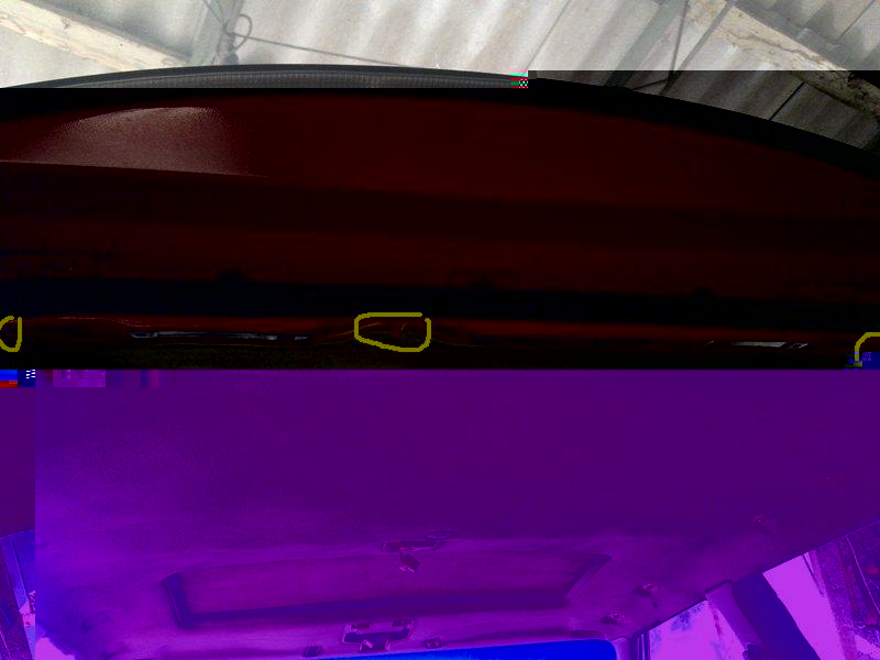 перед нами открываеться вид на плостины которые деражат потолок в районе люка. Отгибаем их все по кругу, их помоему что то около 6 штук. снимаем их но не дерагаем потолок и не пробуем снять думая что на этом все закончилось. Нетт. Продолжаем мучения. Снимаем резинки с дверей- со всех. и аккуратно лезем под потолок. На самом метале есть металическая пластина а на потолке приклеена липкая лента желтого цвета. она находиться во всех проемах дверей кроме задней. берем чтниь тоненькое и отклеиваем ее. Я брал маленькую тонку отвертку. Самое главное ни в коем случаее не делаем опорой для отвертки сам потолок. он хрупкий что просто ппц.