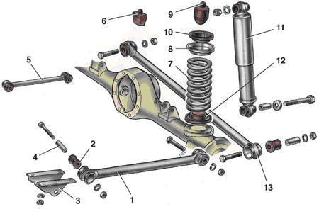 Далее, еще нужна верхняя продольная штанга задней подвески ВАЗ 2106 (на рисунке она под №5) со втулками.
