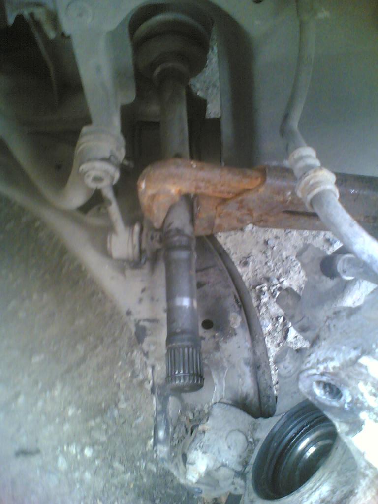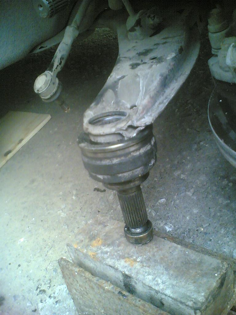 самое главное из-за чего начал рабирать --Граната(он же ШРУС)Здесь немного сложнее,открутили гайку ступицы, сбили с гранаты тормозой диск и ступицу, привод пришлось держать газовым ключем, а отец пару раз ударил по гранате тяжелым молотком и она слетела
