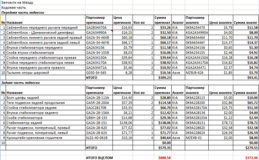 GA2A-28-151  |Стабилизатор задний                      |$138,06   | 1    |$138,06    |KIA 0K9AA28151    |$78,72   |$78,72  |