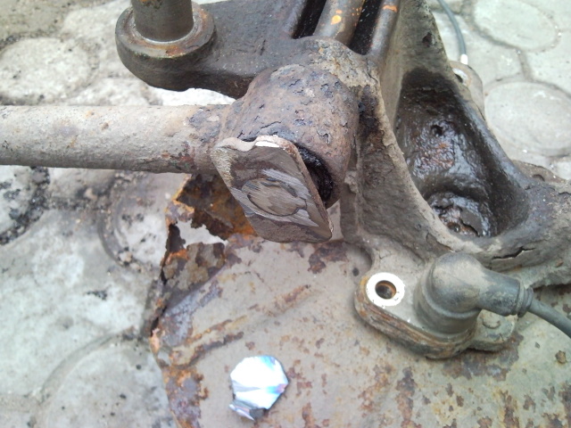 Болты пришлось снимать так: откручивается задняя круглая тяга от кузова, откручивается стойка,снимается суппорт и рамка суппорта , откручивается задняя задняя тяга и всё поднимается на верстак.Болт вырезается болгаркой посередине, т.к средняя часть болта окисляется,её размер увеличивается и он ни в ту ни в другую сторону в уши не лезет. Срезается шляпа болта с прикипевшей круглой тягой возле уха , задний край болта и болт выбивается в середину.Может ещё потребоваться высверлиание болта в ушах. Рак мозга редкостный. Самое главное - у круглой тяки с\блок крепления к кузову HANSE имеет размер 35мм а дыра в тяге 33 мм. Пришлось стачивать с\блок- как следствие уменьшение стенки и заваливание кромки при запрессовке. Кроме того , на тягах поставляемых в запчасти с\блоки цельнорезиновые внутри, а на с\блоках HANSE они внутри с промежутками и надо выбирать как их правильно поставить.