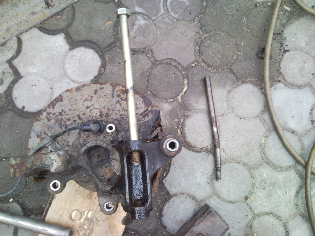 Ходовик вдруг мне звонит и говорит, что у меня одна пара не подходит - после того как впрессовал, он обнаружил, что рычаг (или тяга, в общем палочка с резьбой на конце) не входит в дырочку сайлентблока, узкая она.