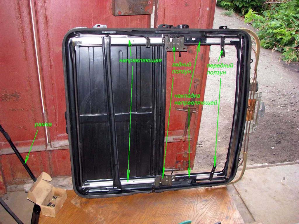 - регулировку (по высоте) закрытого люка в передней части производить вышеописанными винтами, а в задней – винтом, соединяющем две части заднего ползуна (он не для увеличения зазора при поднятии задней части люка).