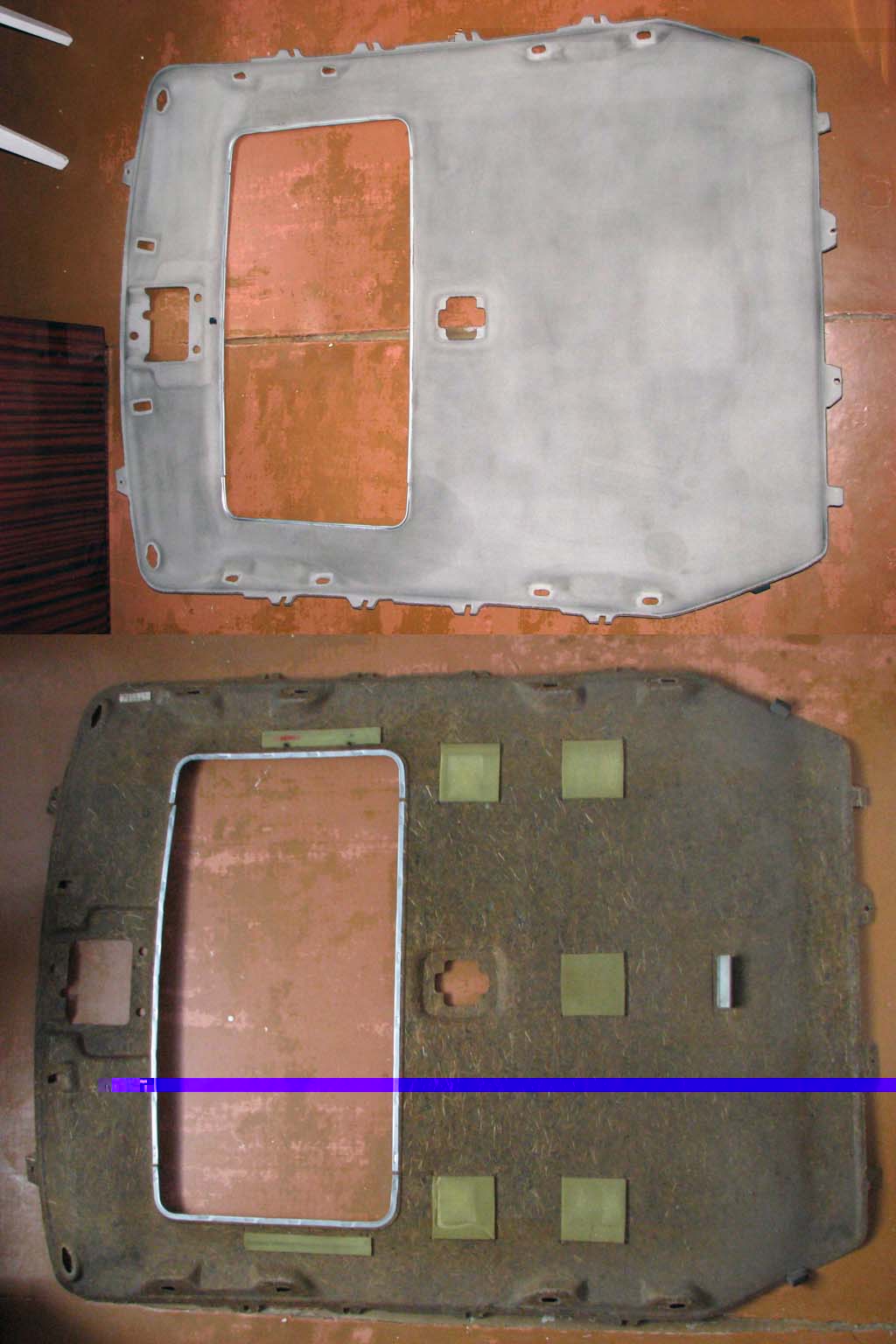 Вид потолка моей машины имел такой вид, как будто по нему ходил кто то в мазутных кирзачах, да и пол был не лучше, ещё и с дырками. Поэтому при первом удобном случае (а точнее при двух) решил это дело исправить: когда разбирал люк для ремонта и снимал обшивку для просушки после езды по оч. глубокой лужи.