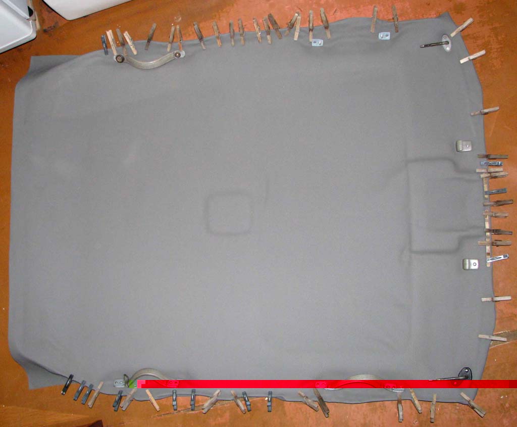 Всё клеилось в течении 3 вечеров на 88-й клей как положено по технологии: намазать обе поверхности, выждать и соединить. Приклеивал сверху на старый материал. Главное сильно много клея не лить на поролон потолка, а то потом он сожмется и склеится. Тогда получатся ямочки как у меня в районе голов задних пассажиров. Для формирования углублений немного растягивал материал. Фиксировал (как видно) прищепками и штатными ручками и крючочками. П-образную окантовку люка обклеил полоской с загибом краев вовнутрь.