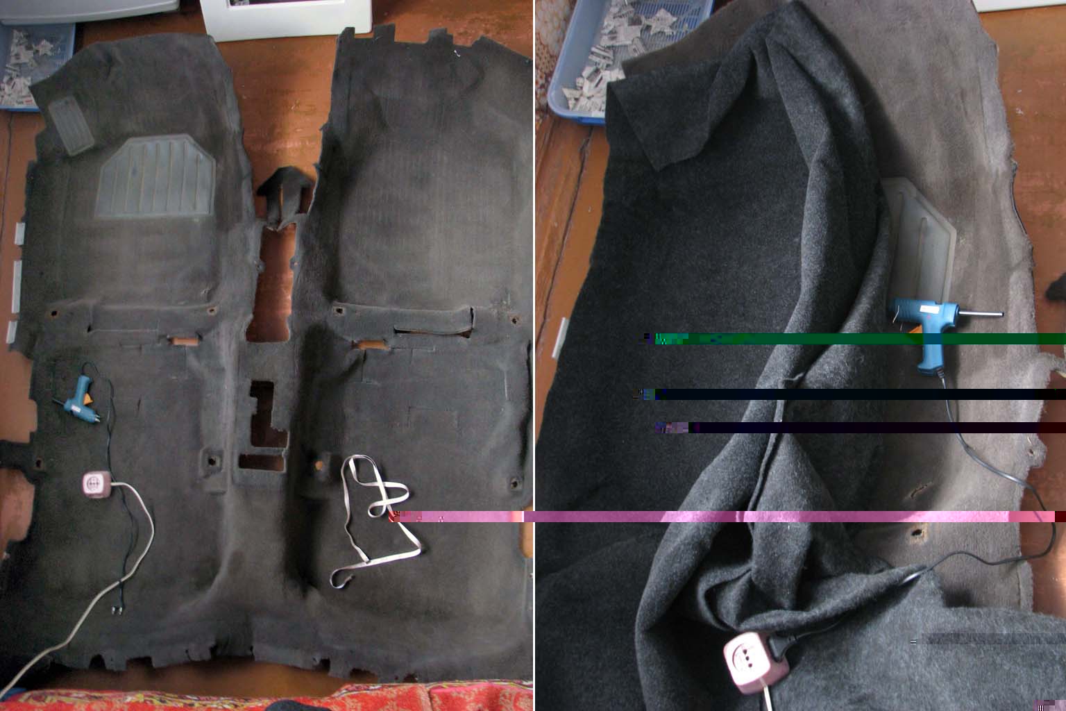 Материал использовал - карпет, куплен в той же палатке (см. выше). Клеил на термоклей - хорошее решение для склейки двух тканей. Пока всё сделал спалил 3 китайских клеевых пистолета. Материал стыковал следующим образом: под передними сиденьями продольные полосы, а перед задним - поперечная, стык расположил под передними сиденьями.