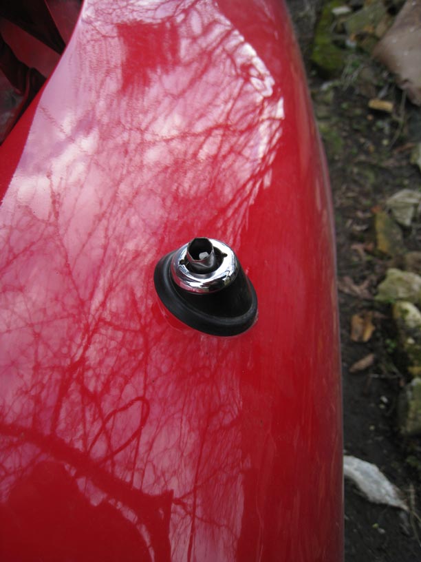 1) Отворачиваем вверху гайку. В отличии от Xedos 6, где верхняя гайка под трубчатый ключ, на MX-6 гайка видимо под какой-то спец инструмент, пришлось упираясь в отверстия шлицевой отвёрткой (осторожно, иначе можно поцарапать крыло) сначала стронуть её с места, затем пальцами открутить против часовой стрелки.