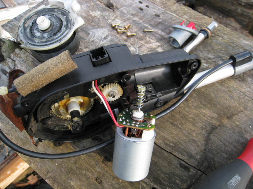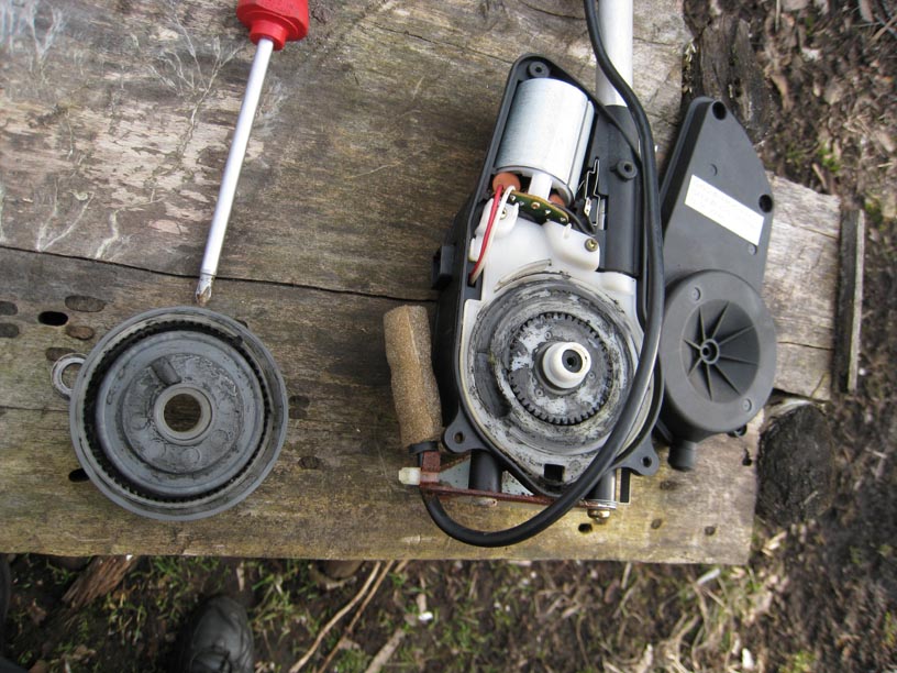 10) Теперь можем вынуть моторчик, почистить и осмотреть щётки. Почистить шестерни, смазать всё силиконовой густой смазкой и поставить новую мачту.