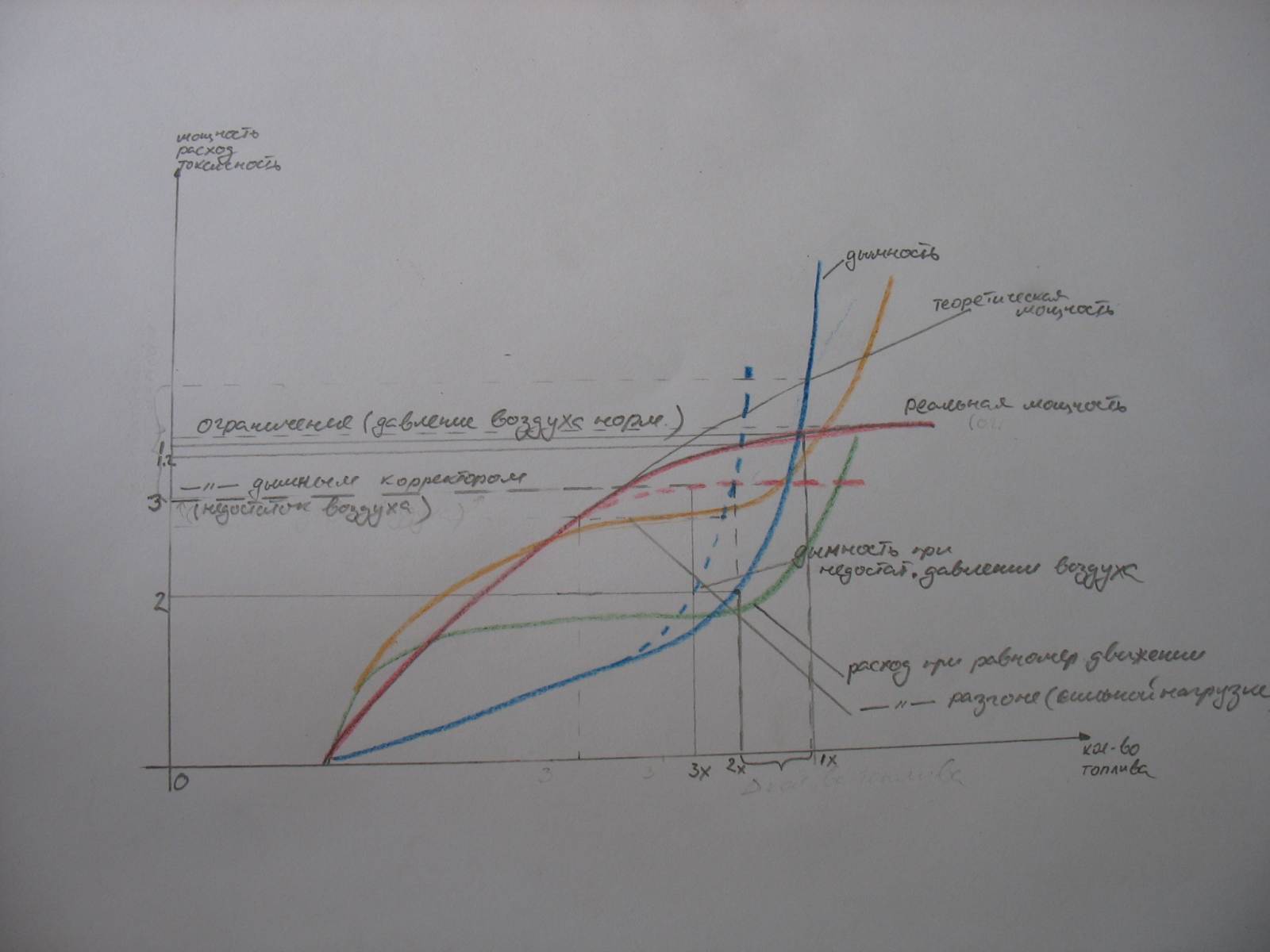 В общем, как видно из графика - мощность (красным) приростает пропорционально подаваемому топливу (это ось Х), но только до определённого предела - когда всё топливо ещё может сгореть (на графике верхний предел - "Ограничение").. Как только колличество топлива становится ещё больше - его остатки вылетают в трубу в виде серого дыма + чёрной сажи.. Дымность ростёт (синим на графике).
